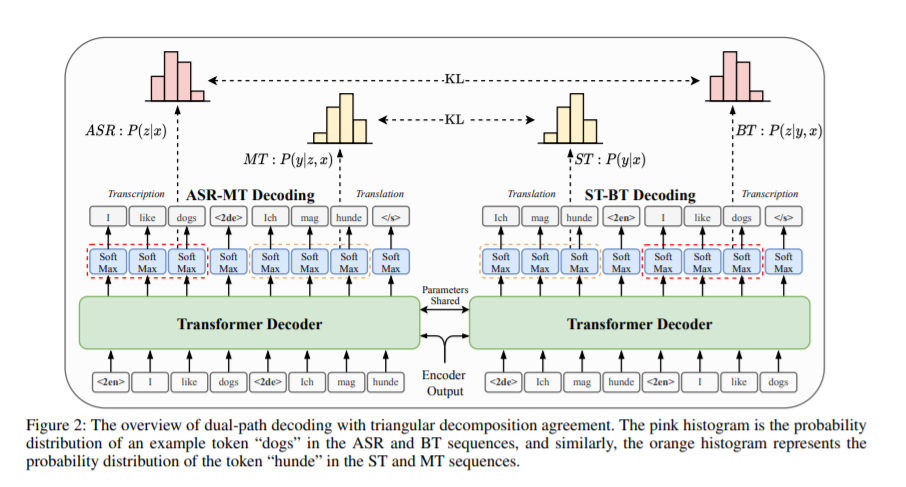 然而,该过程在每个阶段只涉及二元组数据,这种松散耦合未能充分利用三元组数据之间的关联。我们的工作中,尝试基于语音输入对转录和翻译的联合概率进行建模,以直接利用此类三元组数据。在此基础上,提出了一种新颖的三角分解一致性正则化训练方法,以提高对偶路径分解的一致性。