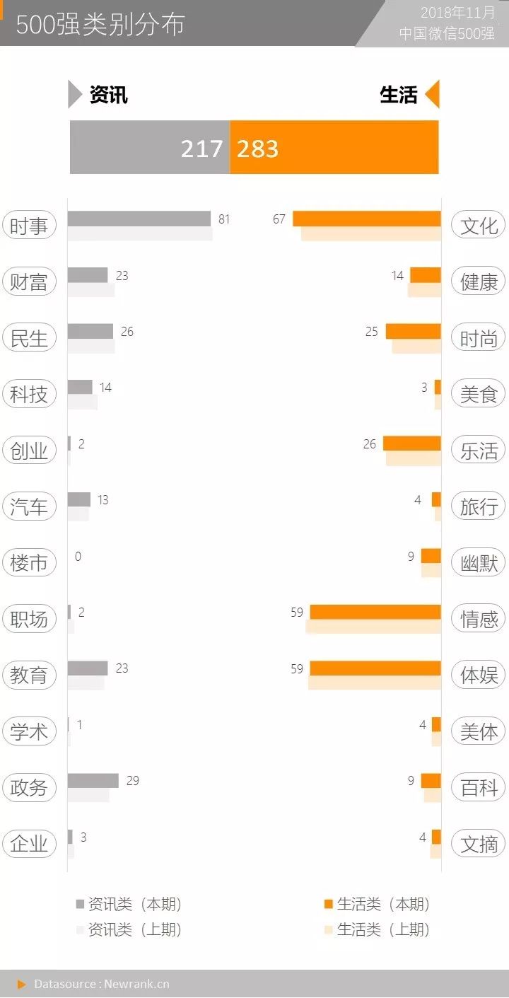 时事(81)、文化(67)、情感(59)、体娱(59)与政务(29)是11月500强中所占席位最多的类别位次。上述五强类别占据500强席位的59%。政务类增加5席,为增员最多的类别。资讯与生活类账号的比例为1:1.3,严肃类账号席位缩减5位。