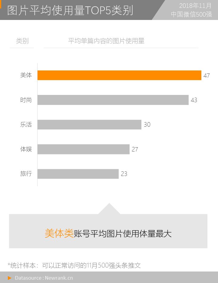进一步对发布图文的公众号进行类别分析,统计每个类别的公众号平均单篇内容中使用的图片数量,发现美体、时尚、乐活、体娱及旅行类公众号中平均使用的图片数量最多。美体类公众号发布的109篇头条图文,平均每篇内容约使用47张图片,远超500强整体平均使用量(18张)。