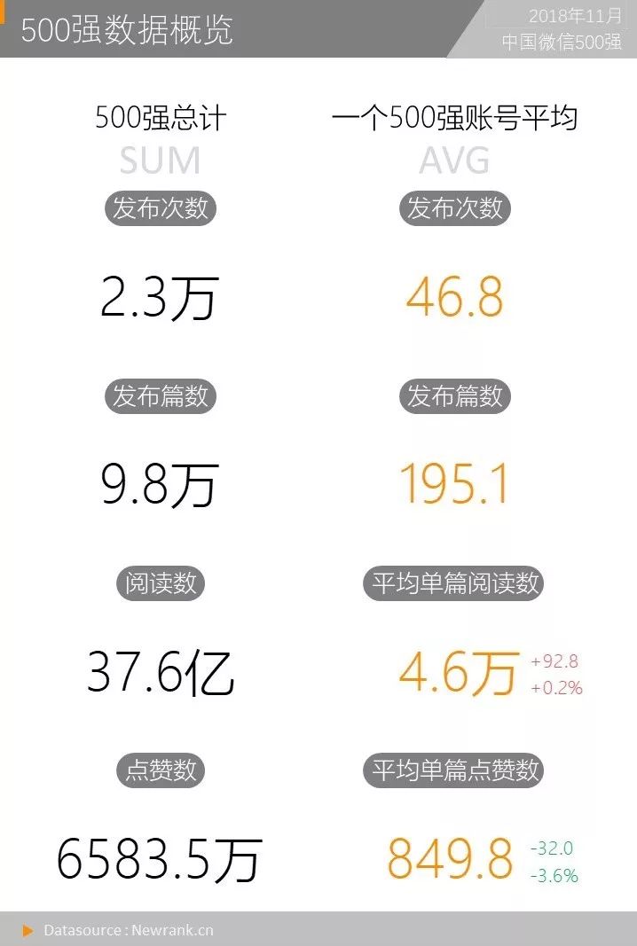 11月500强整体发布9.8万篇内容,总计收获37.6亿次阅读,6583.5万次点赞。