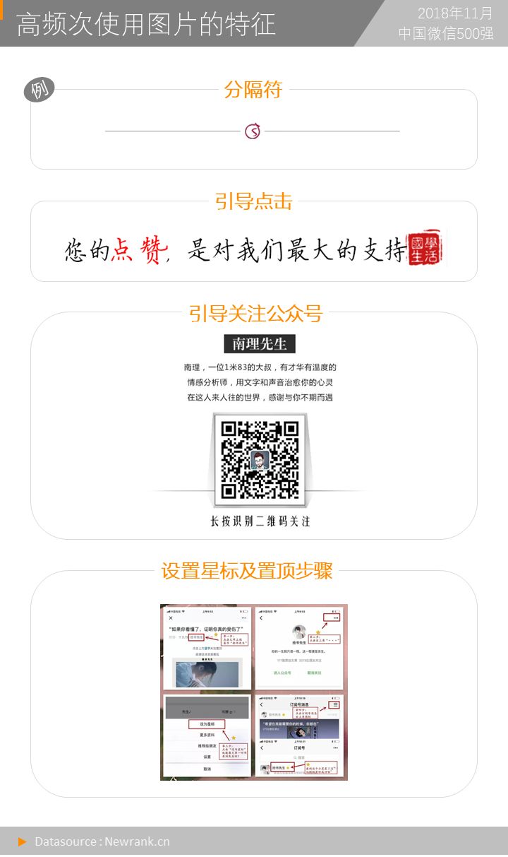 在研究过程中发现,有部分图片在推文中重复出现,整体来看,平均每张图片被使用1.4次。对于单个公众号而言,复用率100%(即在每篇推文中均出现该图片)的图片有明显的特征,主要包含内容分隔符、引导点击(包含引导点赞、引导点击阅读原文等)、引导关注公众号和设置星标及置顶公众号的步骤说明等几类。