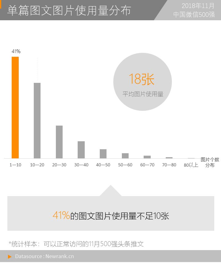 在上述以图文形式推送的22201篇内容中,新榜共获取到392412张图片,平均每篇内容中约包含18张图片。对单篇内容中包含的图片的数量进行分布统计,发现41%的图文使用的图片数量少于10张,仅有59篇内容使用的图片数量超过80张,这其中,使用图片数最多的内容为“深夜发媸”发布的《一百来块的大牌限量款,双11怎么能不买!》,共计使用219张图片。