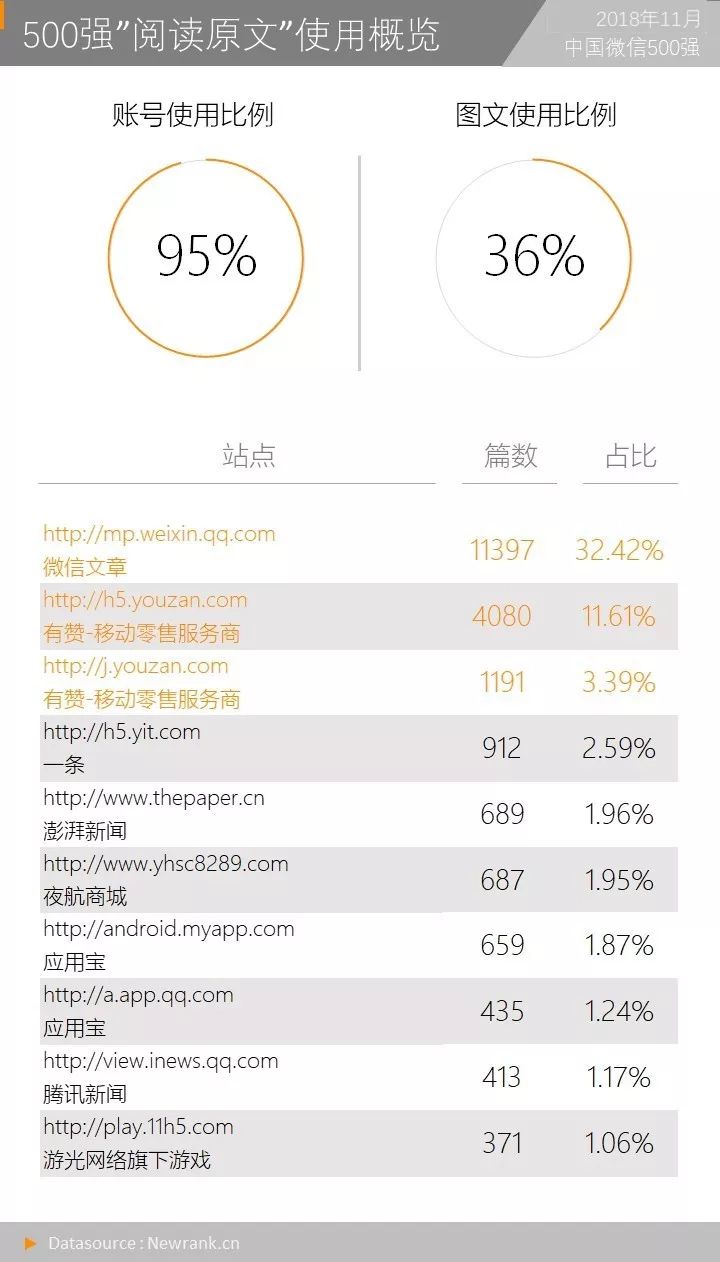 本月共有473个500强账号在35155篇内容中添加阅读原文链接,使用“阅读原文”位置的公众号增加9个,图文使用比例环比下降1%。