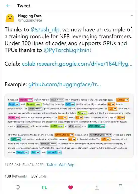这几天,Hugging Face在Twitter感谢了Sasha Rush为他们的huggingface/transformers项目提供的示例代码,该代码仅用300行就实现了命名实体识别(NER)功能。