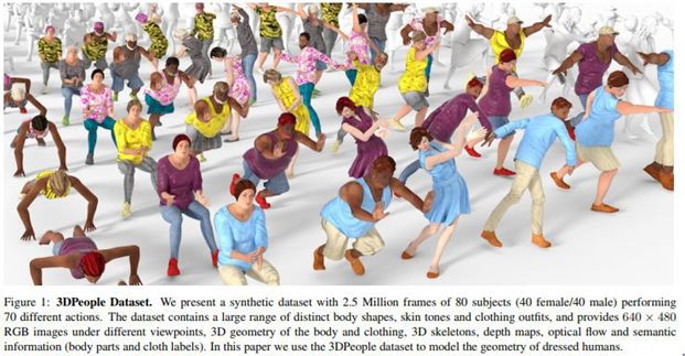 3DPeople数据集是一个大型综合数据集,其中包含了80个人物以不同穿着进行70种行为活动的250万个高精度图像。