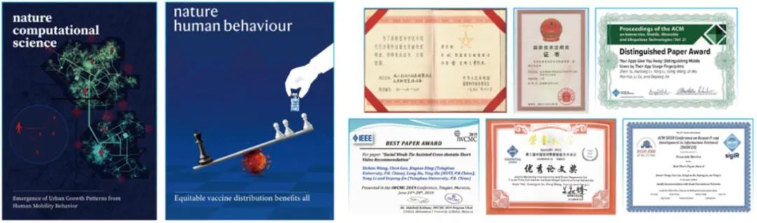 团队在 Nature 子刊等顶级国际期刊与 KDD、NeurIPS、WWW、UbiComp 等顶级国际会议发表学术论文 150 余篇(CCF A 类 70 余篇),文章引用 16000 余次,7 次获国际会议最佳论文 / 提名奖,10 篇论文入选 ESI 高被引用论文;团队主持或参与科技部重点研发计划、国家自然科学基金等项目 15 余项。近年来与华为、腾讯、美团、快手、高德、商汤、丰田以及移动运营商等各类商企也建立了良好的合作关系,各研究课题的研究成果得到了工业界与学术界的广泛认可,已部署于武警总部、中央网信办、公安部等国家重要部门,相关成果 3 次荣获国家科技进步二等奖;团队成员获微软学者 1 人次、电子学会优秀学位论文 1 人次、中国计算机学会优秀博士论文提名奖 2 人次、清华大学优秀学位论文 10 余人次、国家奖学金 20 余人次,清华大学及北京市优秀毕业生 10 余人次。