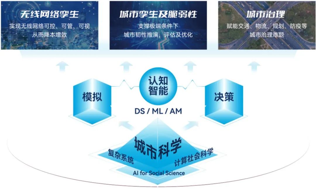 研究中心聚焦于城市科学与计算研究方向,以城市科学为基础研究问题,基于复杂系统、计算社会学等理论展开研究,结合数据科学、机器学习的新一代 “认知人工智能” 为核心技术,服务于城市孪生、城市治理、无线网络孪生等面向国家重大需求的应用领域。