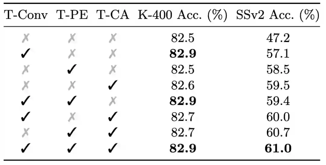 最后我们在表 4 中展示了细粒度时序信息模块的效果。尽管细粒度时序信息对 Kinetics-400 的性能影响有限,但它们对于 Something-Something-v2 的性能十分重要:3 种细粒度时序信息模块在 Kinetics-400 和 Something-Something-v2 上分别合计带来大约 0.5% 和大约 14% 的性能提升。