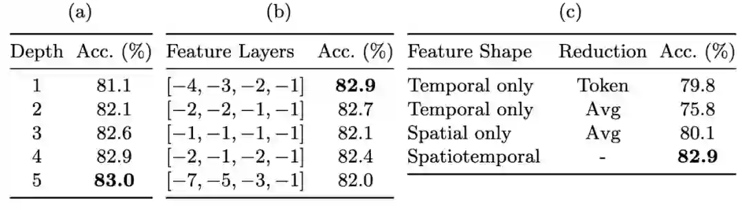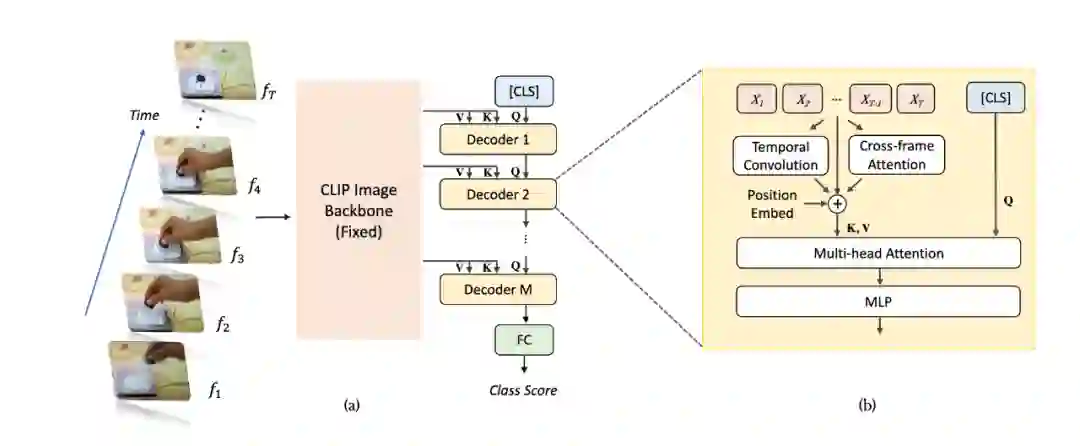 算法的总体示意图如图 2(a)所示。对于一个视频样本,我们取其中的 T 帧输入一个图像识别网络(以 CLIP 为例)并提取特征。与传统方法相比,我们从图像识别网络的最后几层中提取多层、未池化的特征,从而获取更丰富、更细粒度的图像信息;并且图像识别网络的参数权重在视频学习中始终保持固定。随后,多层特征图依次输入一个 Transformer 解码器进行视频级信息聚合。经多层解码后的 [CLS] 特征将用于生成最终的分类预测。