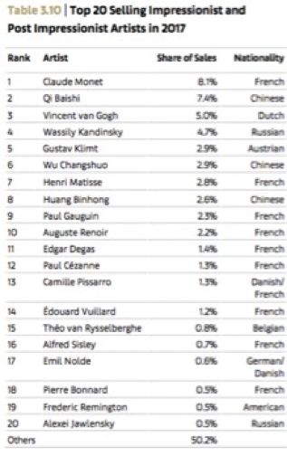 印象派与后印象派时期艺术拍卖版块,2017年全球总销售额为23亿美元,中国同比增长11%,超越美国跃升为2017年该版块全球最大的市场,占全球销售额的35%。