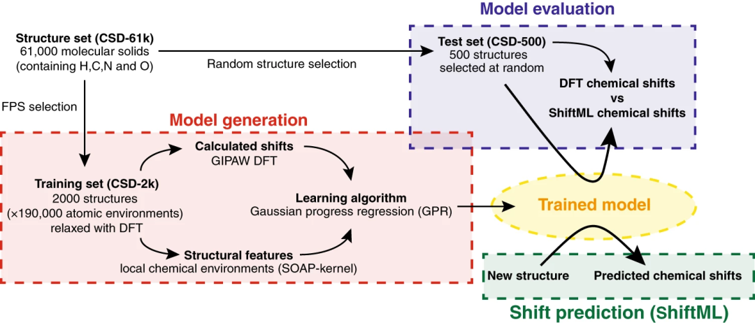 将剑桥结构数据库(CSD)与化学位移的机器学习模型(ShiftML)相结合,创建了自己的有机固体化学位移数据库,可以直接从分子固体结构预测化学位移。