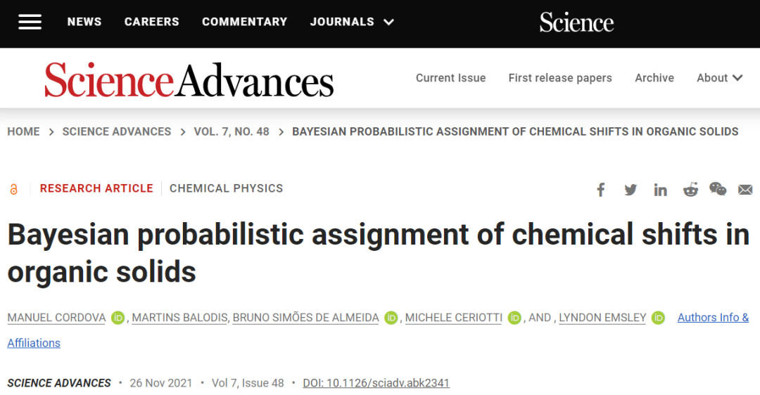 该研究以「Bayesian probabilistic assignment of chemical shifts in organic solids」为题,于 11 月 26 日发表在《Science Advances》上。