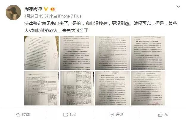 24日,周冲在公号上回应《关于六神磊磊质疑本号签约作者抄袭洗稿一事的相关解释及法律申明》,通过逐段对比、发布手稿释疑,反驳其洗稿的指责,表示拟起诉维权。