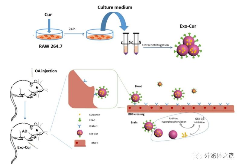 姜黄素(1,7-双(4-羟基-3-甲氧基苯基)-1,6-庚二烯-3,5-二酮,curcumin)是一种新型天然来源的治疗AD的药物。姜黄素结构简单,可以调节Tau的磷酸化。关于Tau磷酸化调节的治疗AD已有报道,因此研究人员旨在从分子水平研究姜黄素对Tau磷酸化调节的影响。为了克服姜黄素溶解度和生物利用度相关题,研究人员用姜黄素处理的小鼠巨噬细胞,制备了细胞分泌的包含姜黄素的外泌体(Exo-cur),这样就改善了姜黄素的溶解度、稳定性和组织生物利用度。外泌体上携带有巨噬细胞来源的淋巴细胞功能相关抗原(LFA-1),LFA-1可以与内皮细胞粘附分子(ICAM-1)相互作用,介导外泌体穿过血脑屏障的侧向迁移和渗透, 这样Exo-cur可以有效地穿透血脑屏障并将更多的姜黄素转移到脑中。研究人员使用冈田酸(OA)诱导Tau蛋白过度磷酸化并建立AD动物模型,通过抑制OA诱导的Tau磷酸化来评估Exo-cur的治疗效果。结果还发现,Exo-cur还可以通过激活AKT / GSK-3β途径抑制Tau蛋白的磷酸化,从而在体内外防止神经元的死亡并减轻AD的症状。