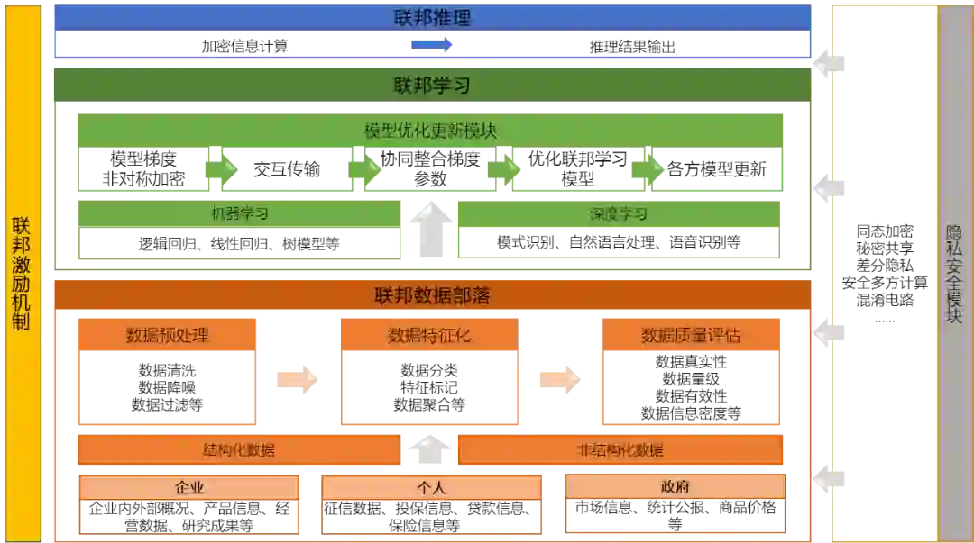 自从谷歌在 2016 年提出了针对手机终端的联邦学习,这个概念开始火爆起来,并被视为下一代人工智能协同算法和协作网络的基础。平安科技提出“联邦智能”的架构,将安全通信、层级加密、可信计算、可视化等真正实现保护用户隐私数据的完整系统囊括进来,联邦学习只是其中一个技术环节。