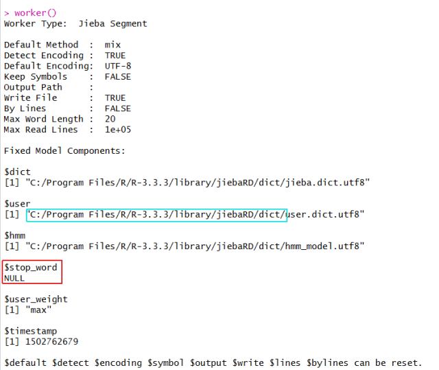 当前的是没有stop_word的,所有词存储的位置在:C:/Program Files/R/R-3.3.3/library/jiebaRD/dict/下