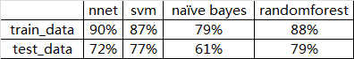 整体上看,nnet是过拟合的,所以在测试集上的效果折扣程度最大;naive bayes模型的拟合效果应该是最弱的,但是好在它的开发成本低,逻辑简单,有统计意义;svm和randomforest这边的效果不相上下。本次训练的数据量在20w条左右,理论上讲再扩大数据集的话,randomforest的效果应该会稳定,svm会下降,nnet会上升。
