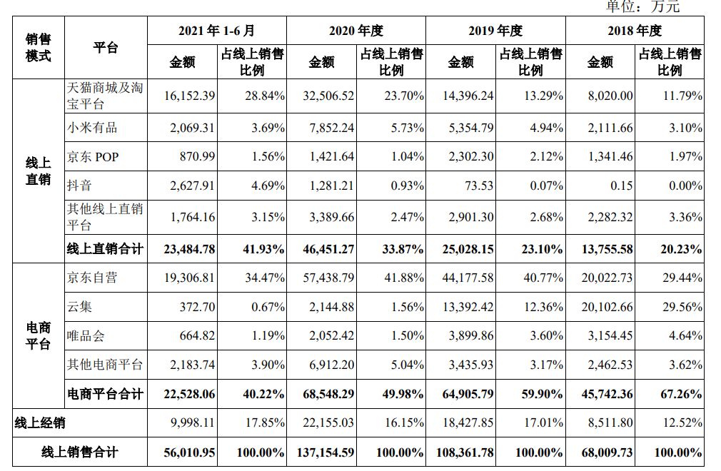 有意思的是,尽管在直播带货上投入了较大成本,但德尔玛的线上收入却呈现逐年下降趋势。根据招股书显示,从2018年到2021年上半年,其线上收入分别占比为70.56%、71.58%、61.68%和 45.03%。