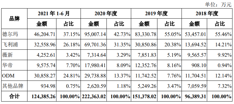 那么,离开了飞利浦加持的德尔玛将会如何?一个明显数据是,从2018年到2021年上半年,飞利浦带来的销售收入分别为1.37亿元、3.09亿元、6.97亿元和3.26亿元,占营收比为14.21%、20.38%、 31.35%和 26.18%。