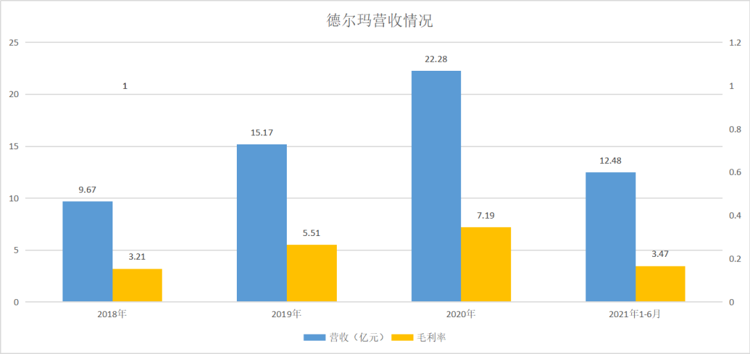 从巨头林立的小家电红海市场中走出来,德尔玛闯出了一条属于自己的野蛮路子。从效果来看,德尔玛的营收相对可观,并且呈现逐年增长趋势。从2018年到2021年上半年,其营收分别为9.67亿元、15.17亿元、22.28亿元和12.48亿元。净利润分别为0.47亿元、1.06亿元、1.7亿元、0.47亿元。