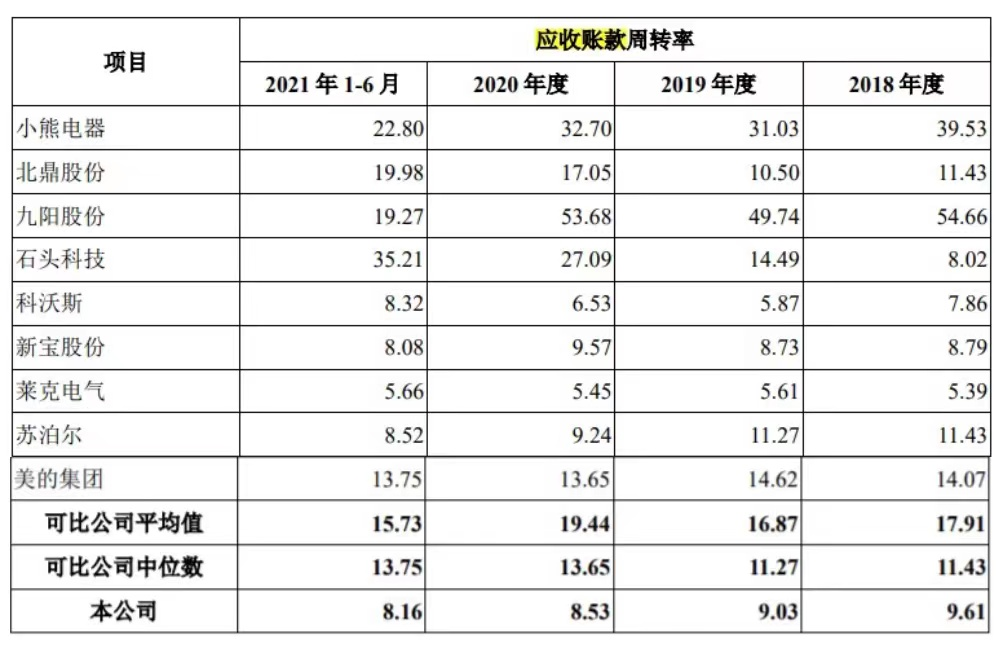 这也导致对比同行,德尔玛的应收账款,并不怎么好看。从2018年至2021年上半年,德尔玛的应收账款净额分别为1.49亿元、1.87亿元、3.35亿元和 2.76亿元;应收账款周转率则分别为9.61、9.03、8.53 和 8.16。而导致营收账款增加及周转率下降的主要原因,就是小米的应收账款增加,同时小米回款存在一定周期。