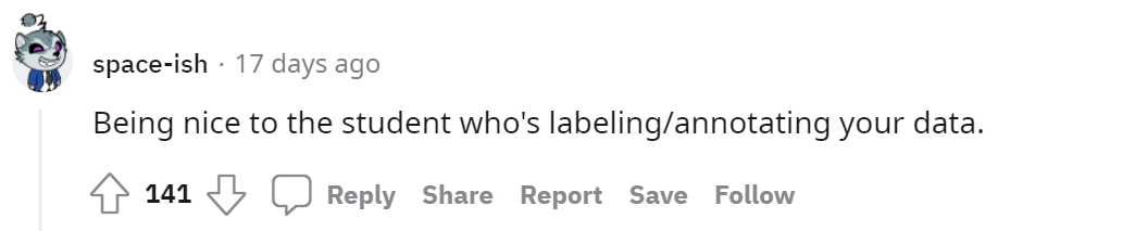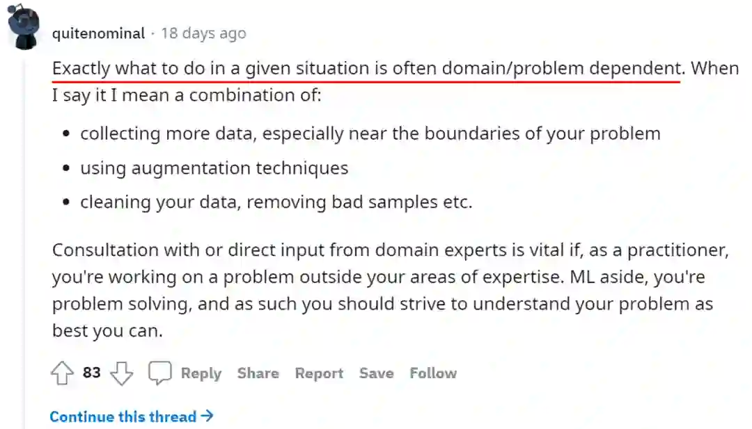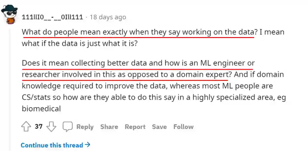 而在这些关注数据的回答中,也有人开始反思,我们所谓的数据工作究竟意味着什么?在一些高度专业化的领域场景里,作为算法工程师,我们所做的所谓“创造性”的工作,真的只是不断的搜集更多更好的数据吗?甚至再往上推,我们的所谓更好的更多的标注数据是如何来的?答案很可能是来源于领域内的专家的知识,那么,当这些算法知识与工具的学习成本与门槛下降,一个算法工程师相对于一个懂算法的行业专家的优势何在呢?