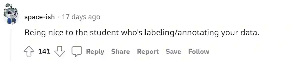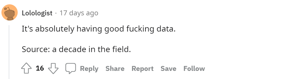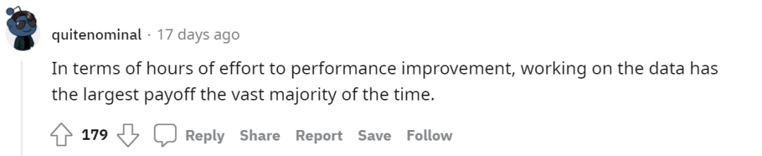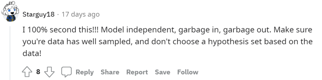 除此之外,还有许多支持“数据”是最大影响的因素的回答,比如,有人认为“Garbage in, Garbage out”,因此数据无疑是任务执行好坏的源头活水。