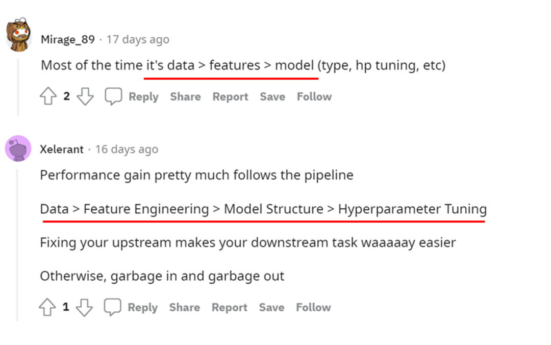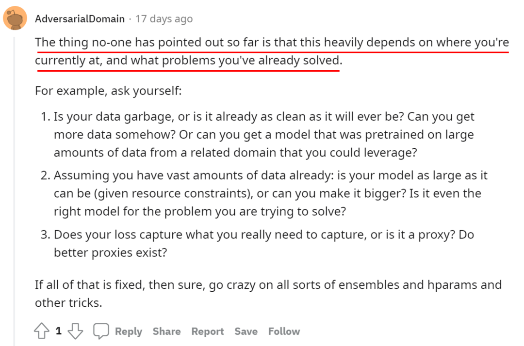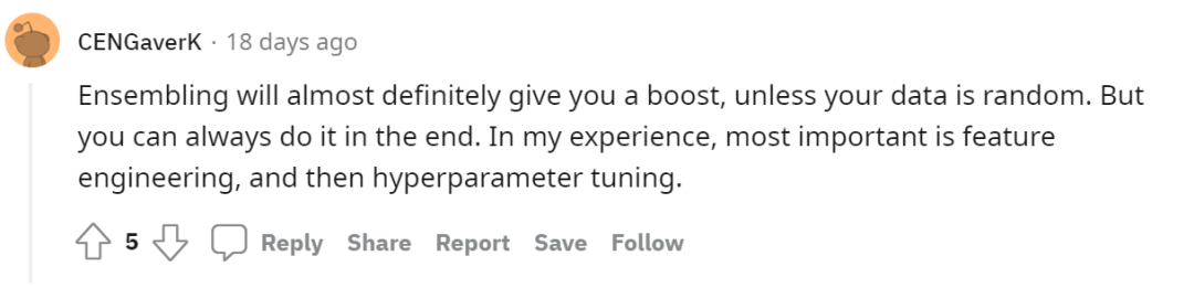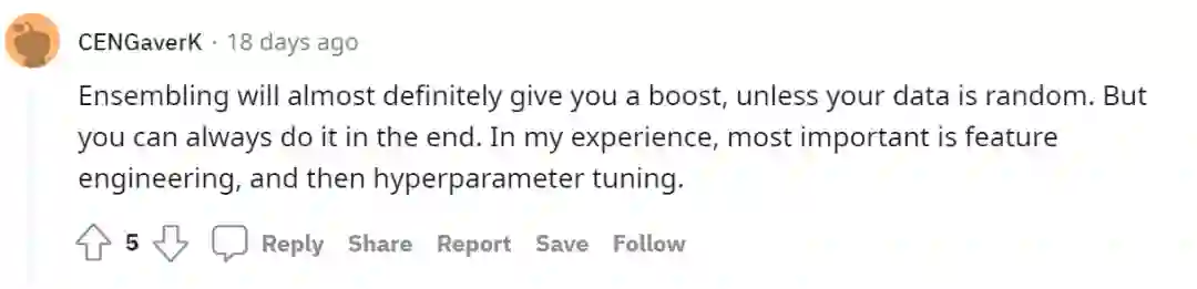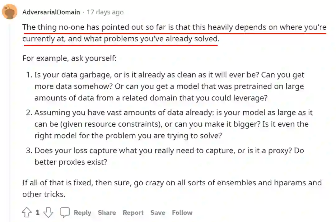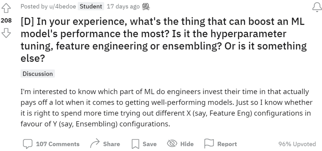 最近,在 Reddit 上,这样一个问题引起了广泛的讨论,提问者发问:“在你的经验里,什么是最能提升一个机器学习模型性能的东西,是调参?特征工程?模型集成?还是其他东西?”