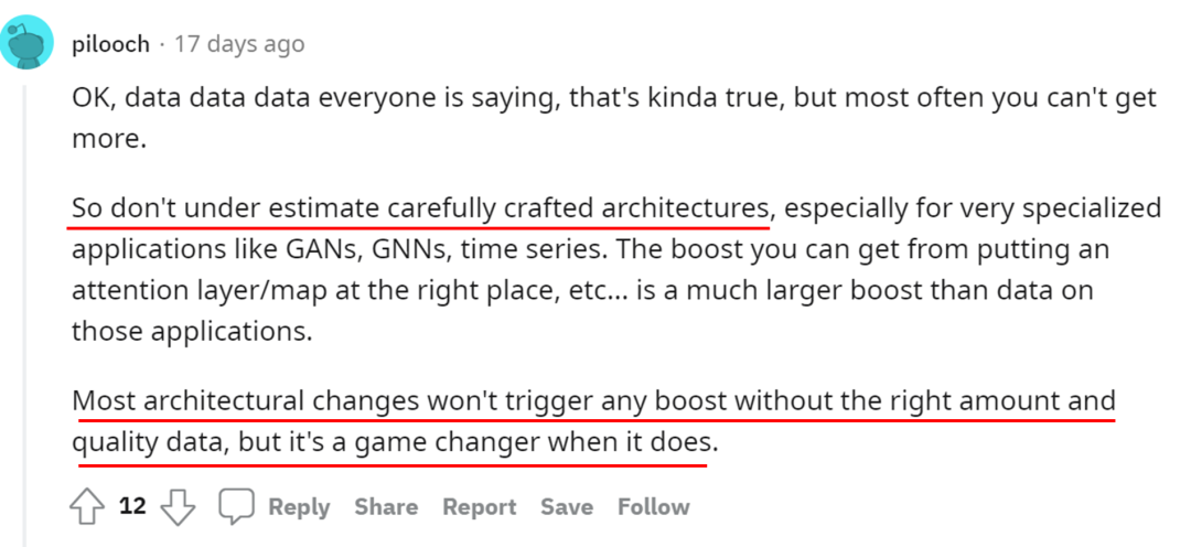 其实回想AI的发展,里程碑式的进步大多来源于模型的更新,也许正如这个回答里说的一样“可能大多数模型的改变在没有足够好与足够多的数据的支持下不会带来性能的提升,但是一旦这个模型做到了,那么它将会是一个 Game Changer”