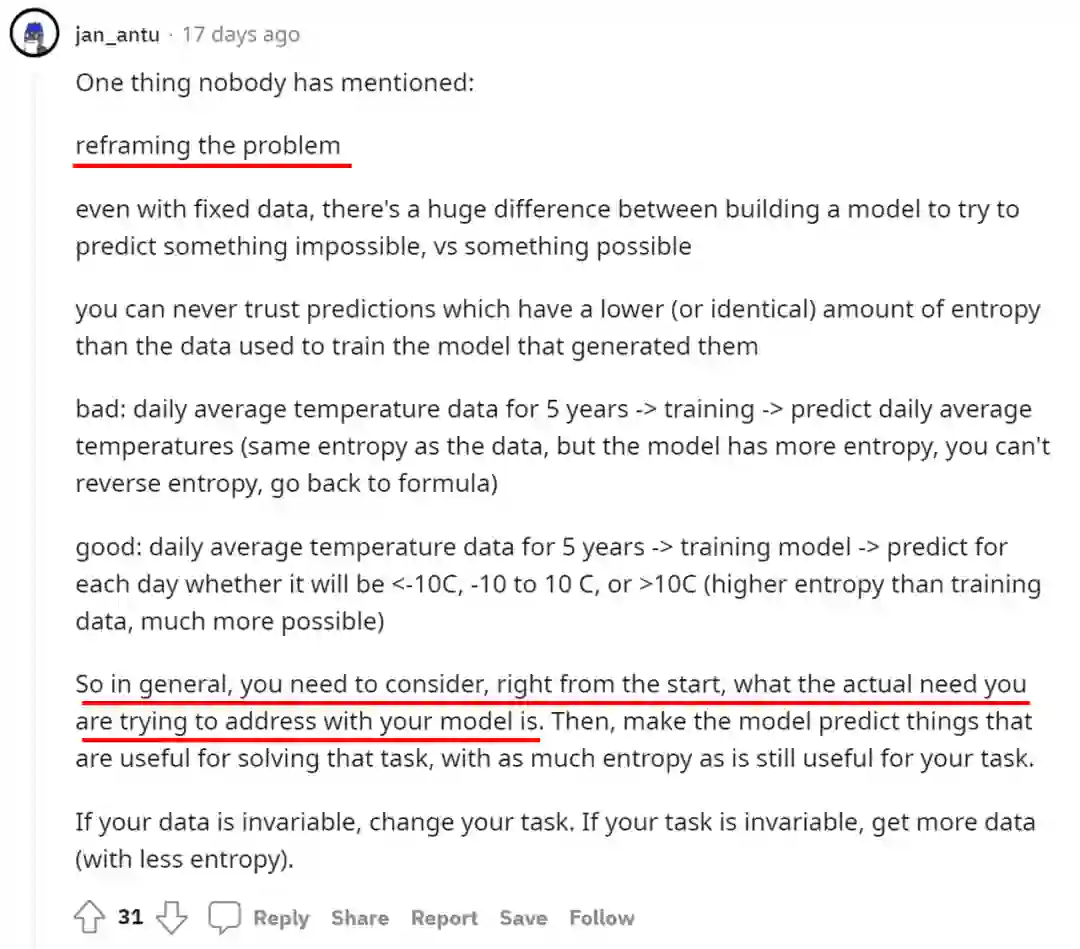 除了这些大家都或多或少知道的方法以外,还有人从另一个角度思考问题,指出了“重构问题”或许会更加重要,这个回答认为对问题的定义不同,会对这个问题的求解带来显著影响。