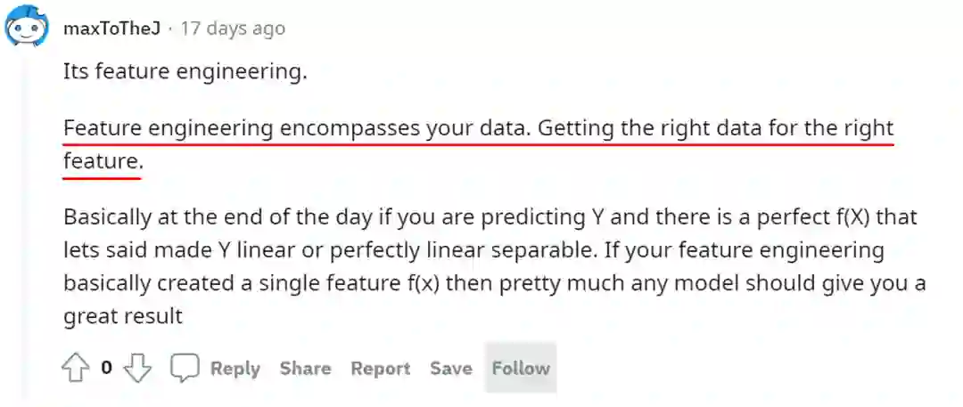 而除了主流的认为数据是最重要的影响因素的声音之外,还有一些其他的答案也十分的引人瞩目。比如,有人投票给了特征工程,认为“特征工程可以得到正确的数据以输入给正确的模型”。