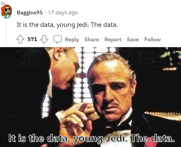 OK,如果和 Reddit 上的结果一样,那么应该是“数据”高票当选全场最佳,榜首的回答“It is data, young Jedi. The data”收获了571条点赞。