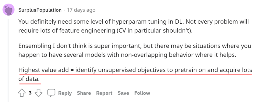 也有人则认为并不是所有任务都要求大量的特征工程,因此强调了在深度学习中预训练的重要作用。
