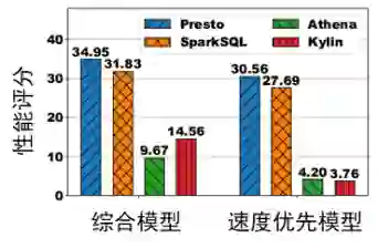 从图 3 中可以看出,运行均匀查询时,Athena 和 Kylin 是较好的解决方案。但是,使用不同模型会得到不同的评估结论。当综合考虑查询速度的云上成本时,由于 Athena 直接通过调用服务执行查询,因此云上成本较低,评分也更低。但是,当优先考虑速度时,由于 Kylin 使用预计算技术实现了高速查询,因此使用速度优先模型时,Kylin 的评分更低。