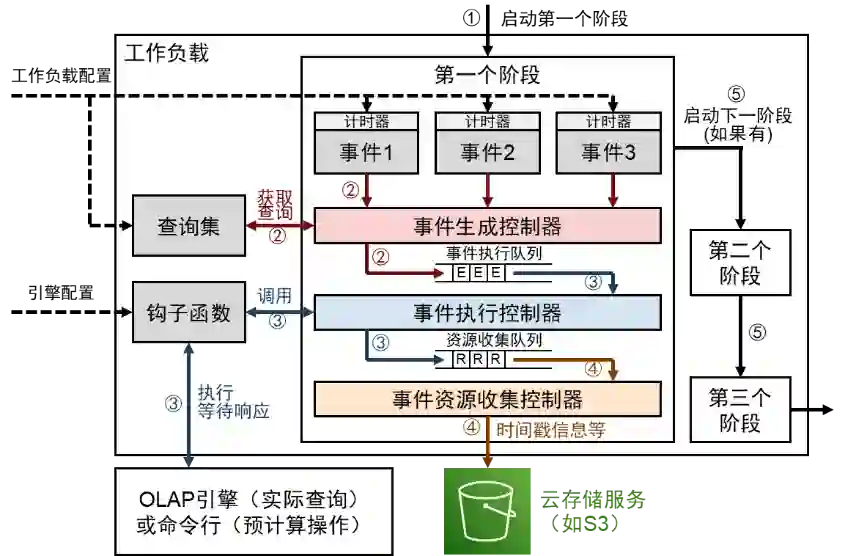 3、配置控制与分发模块触发工作负载执行模块,工作负载执行模块启动配置好的 OLAP 引擎,并根据工作负载设置随时间向 OLAP 引擎发送查询请求。