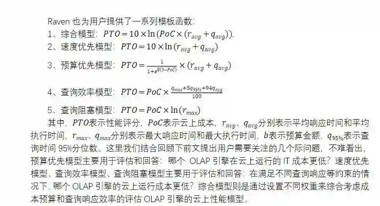 Raven 给出的评分是相对的,只能在相同模型的评分之间进行比较。性能评估得分是云上成本和云上开销的乘积,评分越低,OLAP 引擎的性能越好。云上开销可使用线性模型,对上述参数赋予权重计算;也可使用非线性模型,将上述参数代入到一个函数表达式中。