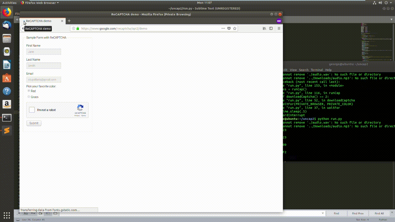 由于 unCaptcha2 必须转到屏幕上的特定坐标,因此你需要根据设置更新坐标。这些坐标位于 run.py 的顶部。在 Linux 上,使用命令 xdotool getmouselocation --shell 查找鼠标的坐标可能会有所帮助。