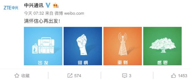 中兴今日正式解禁。中兴在官方微博上了一条消息:“满怀信心再出发!”下面还写了四个字:出发、何惧、重燃、感恩。