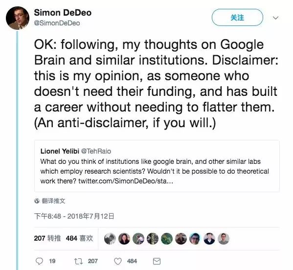 Twitter今天出现了一条惊爆tread:CMU助理教授Simon DeDeo炮轰谷歌大脑,认为他们没在做真正的科学,只是用强大的算力以及招揽到的众多优秀博士生,不断快速推出机器学习工程成果,而真正的知识还跟20年前一样!