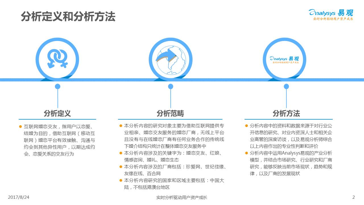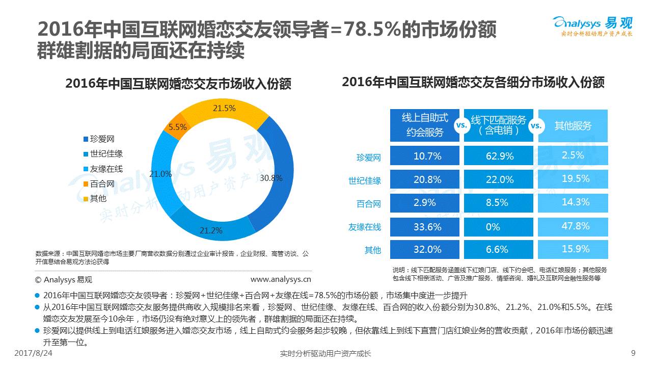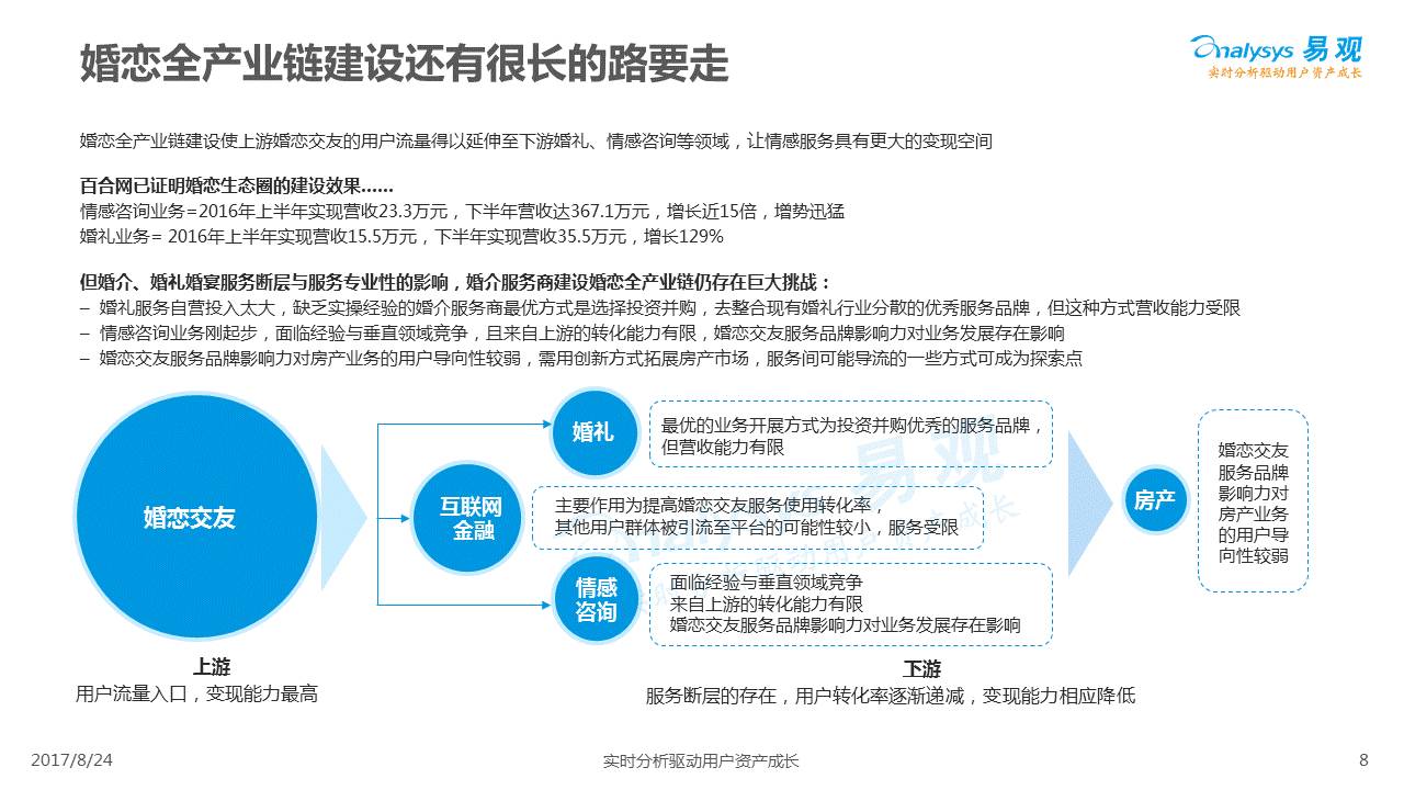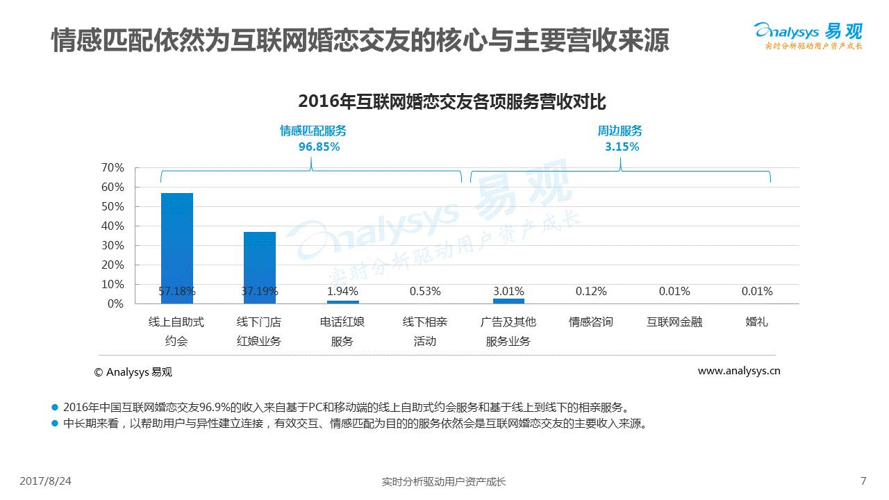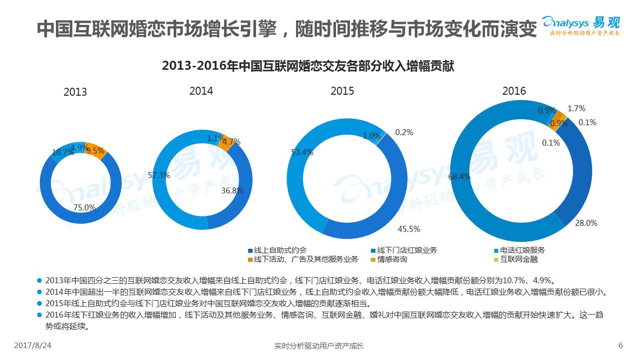中国互联网婚恋市场增长引擎,随时间推移与市场变化而演变,情感匹配依然为互联网婚恋交友的核心与主要营收来源,婚恋全产业链建设还有很长的路要走。易观为您带来《2017中国互联网婚恋交友服务年度分析》,愿连理枝花繁叶茂,比翼鸟长长久久。