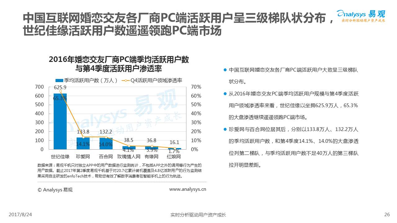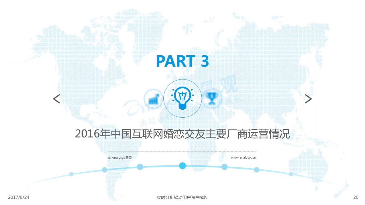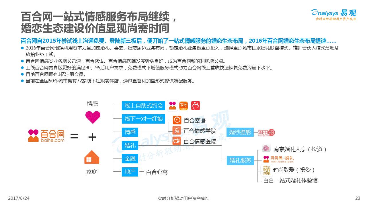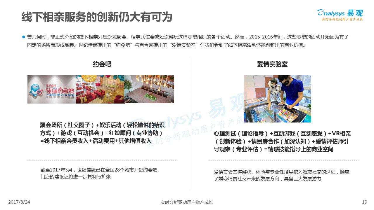 中国互联网婚恋市场增长引擎,随时间推移与市场变化而演变,情感匹配依然为互联网婚恋交友的核心与主要营收来源,婚恋全产业链建设还有很长的路要走。易观为您带来《2017中国互联网婚恋交友服务年度分析》,愿连理枝花繁叶茂,比翼鸟长长久久。