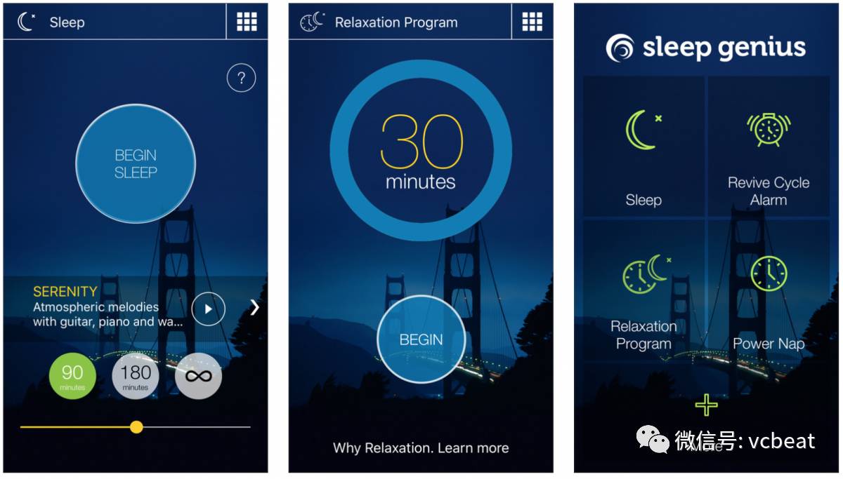 睡眠天才提供一个基于研究的放松程序来解决失眠和睡眠问题。支付4.99美元用户便能得到解决四个放松难题的方法、一个小憩的程序以及一个基于睡眠周期的闹钟。