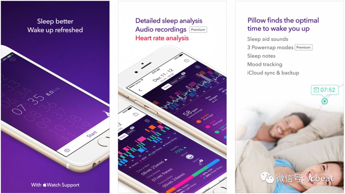与Sleep Cycle类似,Pillow枕头的功能包括睡眠跟踪和分析和智能闹钟。Pillow也融入到苹果生态系统的不同部分,与苹果健康和Apple Watch一起工作,通过它的心率追踪器可以收集更多的信息。