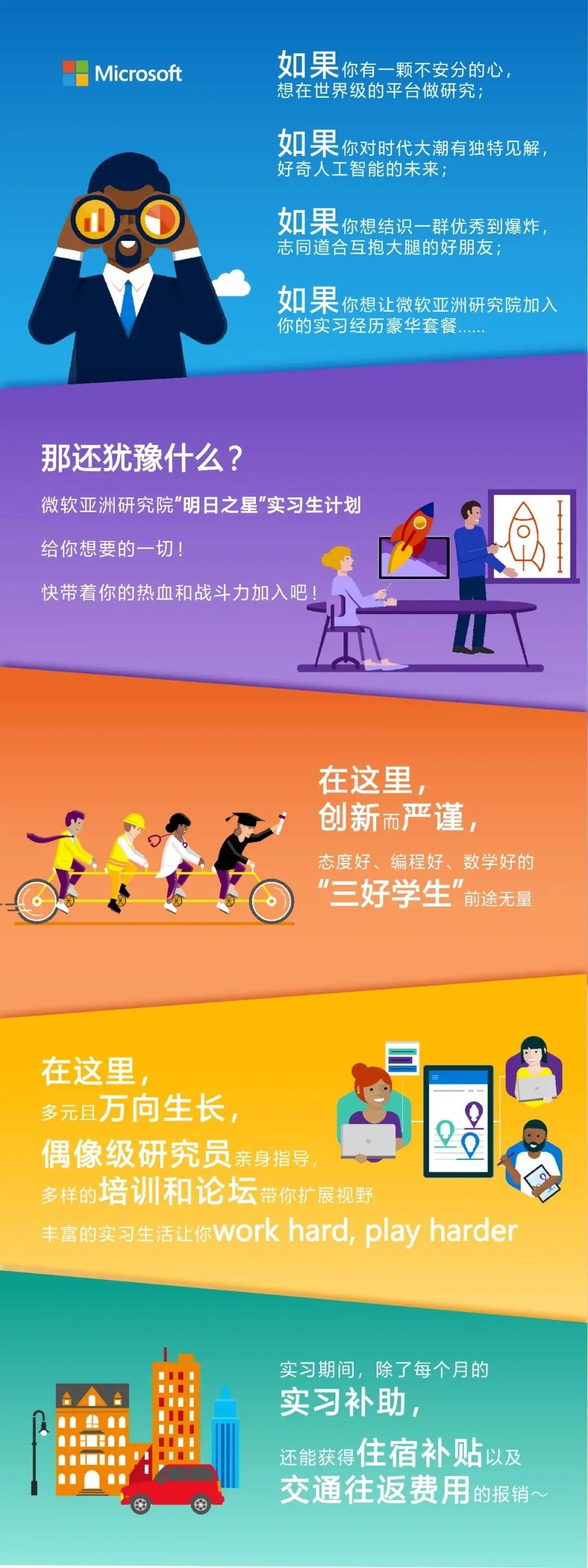 微软“明日之星”实习生项目自 1998 年启动以来,已经有来自清华、北大、中科大、上海交大、香港科大等全球 300 多所高校和科研机构的同学来微软亚洲研究院实习。
