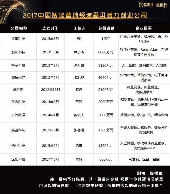 基于此,数据猿通过对成立于2012年之后,在资本市场上获得高度认可,业务发展迅速、业界口碑良好,且为非被收购企业、非上市公司的所有独立创业公司近1年的关注,并与上海大数据联盟、首席数据官联盟、深圳大数据产业协会四方的共同探讨与研究,评选出以下10家在2017年表现优异的中国智能营销领域最具潜力的创业公司供业内参考。
