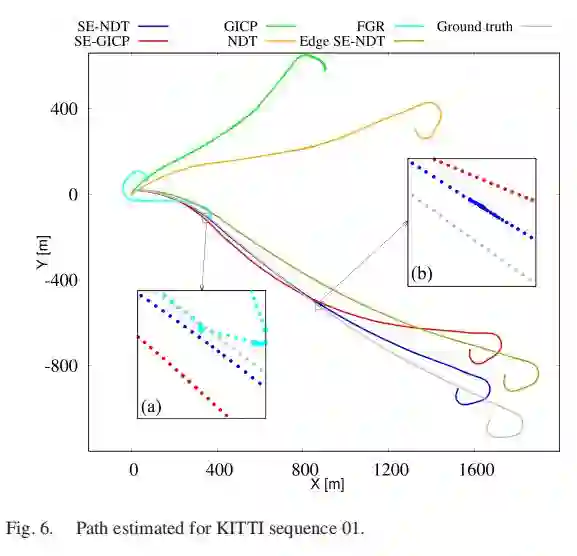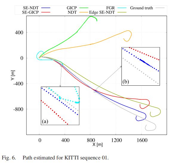 图6展示多种方法进行路径估计,在几何特征较少情况下Fast Global Registration配准方法出现了严重的错误,加入语义信息的SE-NDT和SE-GICP算法相比较原始算法有很大的改进。