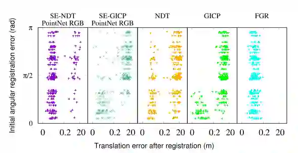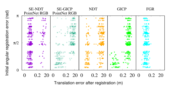 图1展示了多种配准方法相对于初始旋转误差的转化误差,我们使用对数标度来度量误差,理想的配准算法将所有点集中在0m的垂直线上。 Fast Global registration配准对于初始误差是不变的,因为在优化中不使用初始估计;当初始旋转误差很大时GICP明显配准失败;SE-NDT算法在对比方法中受到最小影响。