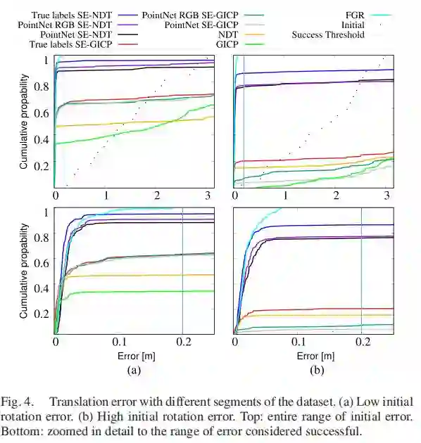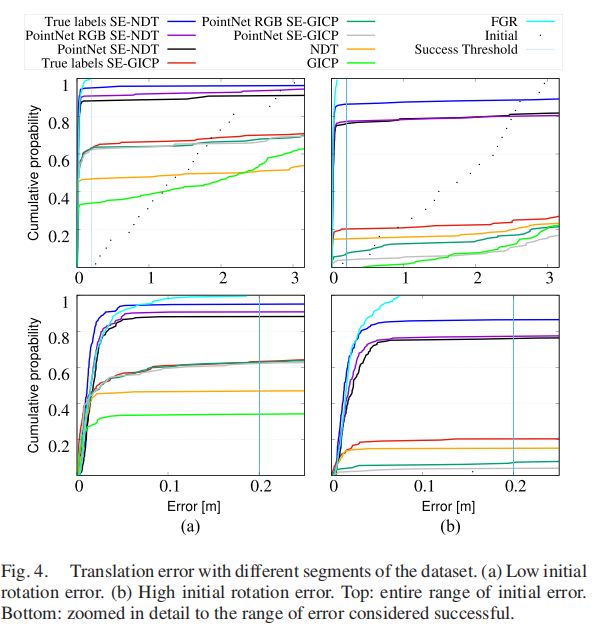 图4a显示了对初始旋转误差最小50%的集合进行配准后平移误差的累积分布。图4b显示了初始旋转误差50%以上的集合配准后平移误差的累积分布。初始旋转误差对SE-NDT和FGR的影响很小。FGR的性能差异可以归因于随机变化。
