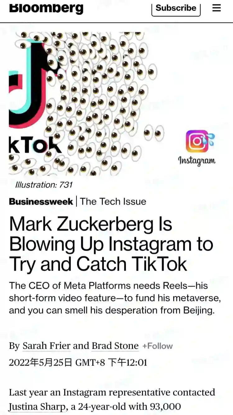 “我在TikTok上的粉丝更多,挣到的钱也更多。虽然13岁就开始玩Instagram, 但我对TikTok的感情更深,” 夏普对彭博周刊表示,她对Instagram基本毫无感情可言,对Reels就更少了。“Reels就是Meta用来抢夺市场赤裸裸的工具,他们没花什么心思在改良Reels上”。