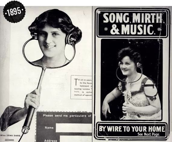 在 Mercadier 的发明后仅仅三年后的 1894 年,用于休闲的耳机就诞生了。英国 Electrophone 公司推出了一套音频系统。它由两个耳罩式发声单元和一条连接到剧场的电线组成。只要每年付 5 英镑,使用者就可以足不出户,收听到伦敦大大小小的剧场的节目的「现场直播」。这不仅是耳机第一次用于音乐聆听,也可以说是最早的有线广播系统的雏形了。
